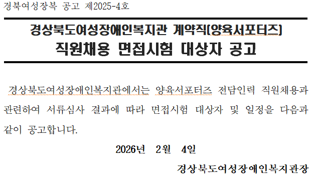경상북도여성장애인복지관 계약직(양육서포터즈) 채용 면접시험 대상자 공고(제2026-4호) 최고관리자 0 61 02.04 14:15 2026.02.04 14:15 양육서포터즈 면접시험 대상자 공고.hwp (60.0K) + 24