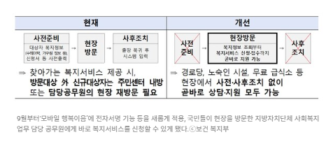 이제는 국민들이 주민센터를 방문하지 않아도 가정 내, 경로당, 무료급식소 등 현장에서 만나는 공무원이 소지한 태블릿을 통해 모바일 행복이음에서 신청서를 확인하고, 전자서명을 완료하면 즉시 사회보장급여 및 서비스 신청(접수)가 가능해졌다.
