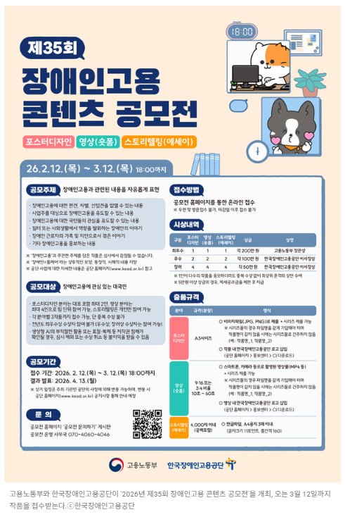 【에이블뉴스 이슬기 기자】고용노동부와 한국장애인고용공단이 '2026년 제35회 장애인고용 콘텐츠 공모전'을 개최, 오는 3월 12일까지 작품을 접수받는다.