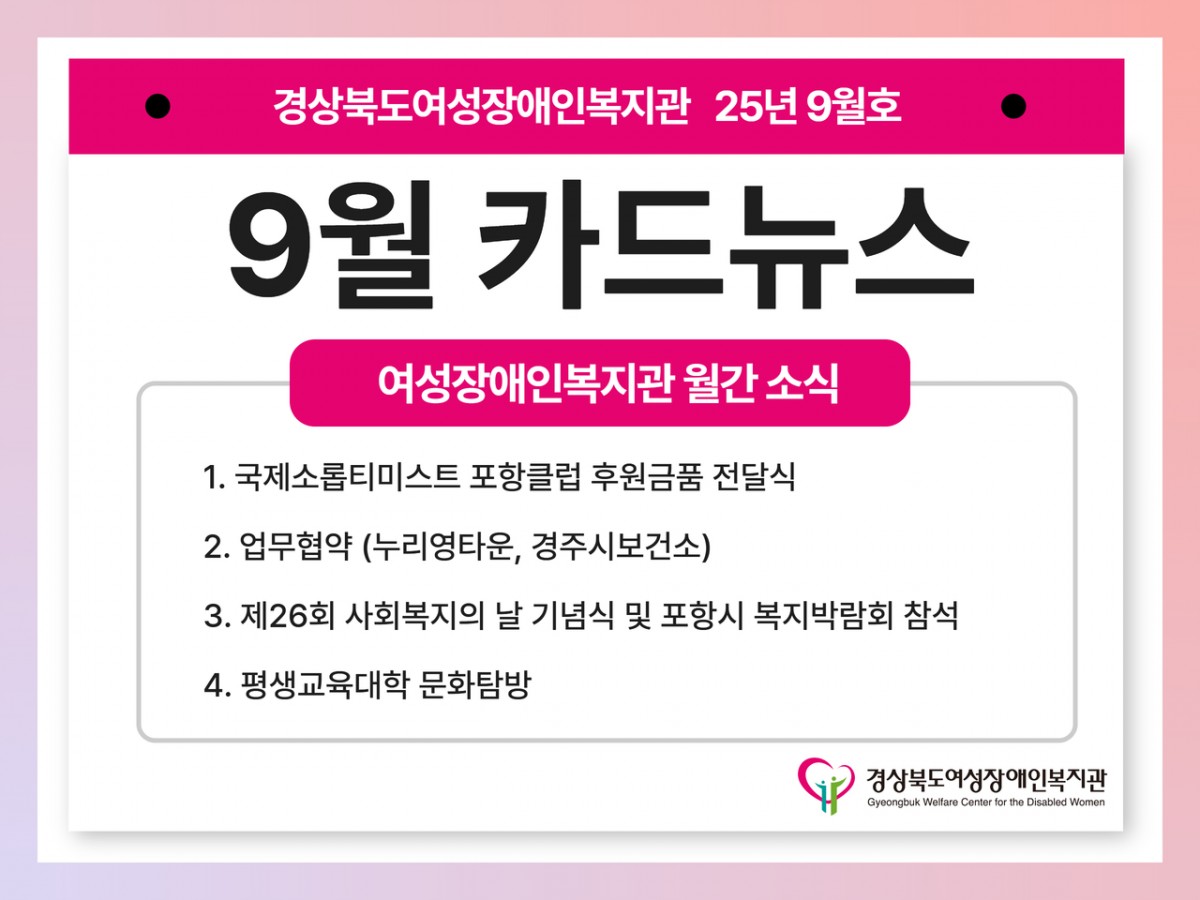 여성장애인복지관 9월 카드뉴스 전예지 0 78 09.25 16:23 https://www.youtube.com/shorts/idaHUfqxRCU + 19 ✨ 25년 9월호 소식 알려드림 ✨안녕하십니까 경상북도여성장애인복지관입니다. 여성장애인과 함께하는 우리 복지관의 특별한 순간들을 모아봤습니다. 작은 변화들이 모여 큰 희망이 되고, 여러분의 관심과 응원이 여성장애인의 삶을 밝히는 힘이 됩니다.
