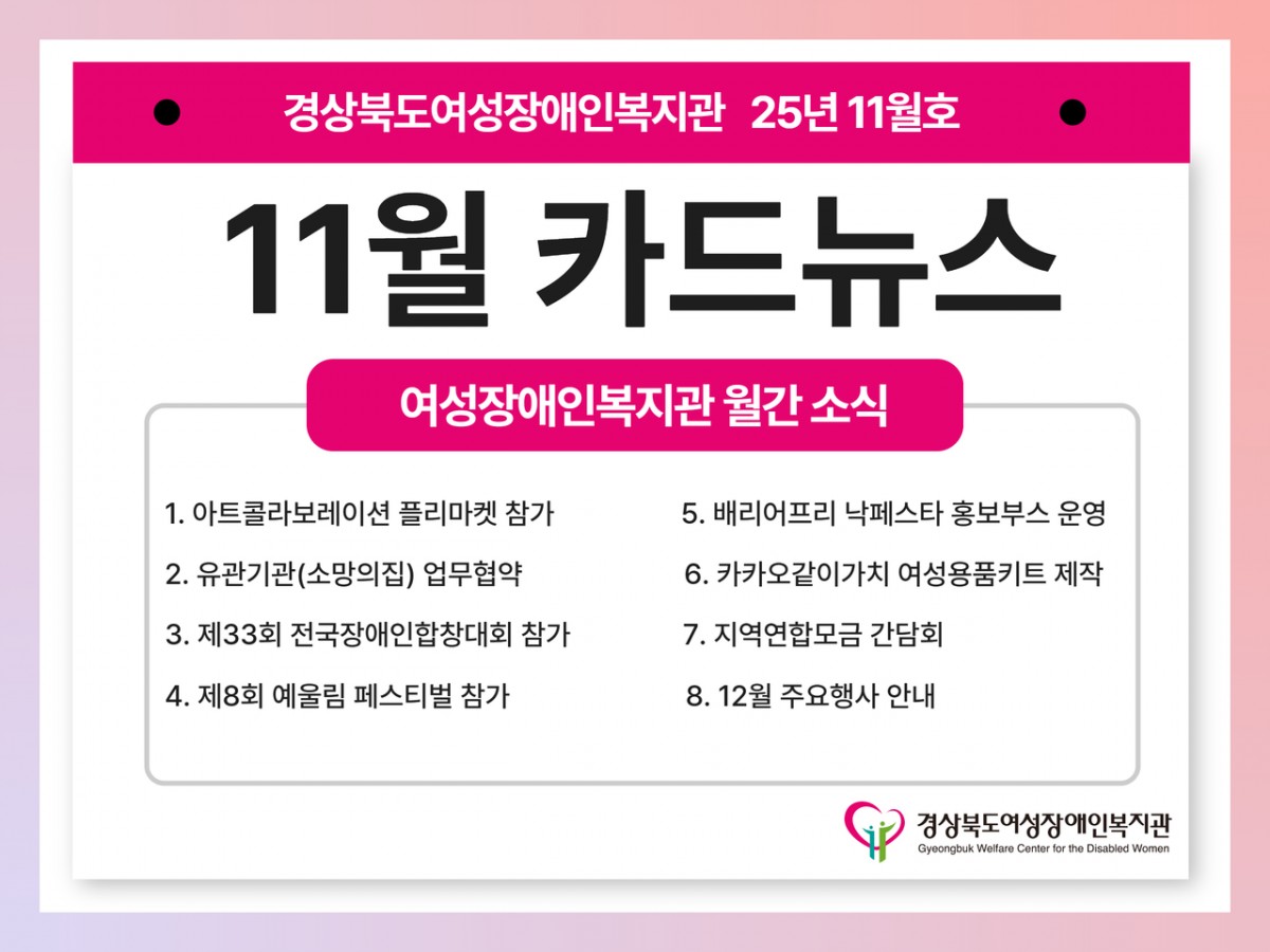 여성장애인복지관 11월 카드뉴스 전예지 0 13 12.01 11:35 https://www.youtube.com/shorts/g8CfMKfC04s + 1 ✨ 25년 11월호 소식 알려드림 ✨안녕하십니까 경상북도여성장애인복지관입니다. 여성장애인과 함께하는 우리 복지관의 특별한 순간들을 모아봤습니다.작은 변화들이 모여 큰 희망이 되고, 여러분의 관심과 응원이 여성장애인의 삶을 밝히는 힘이 됩니다.
