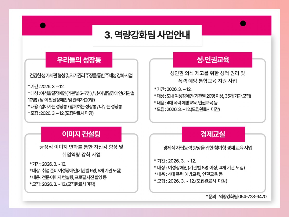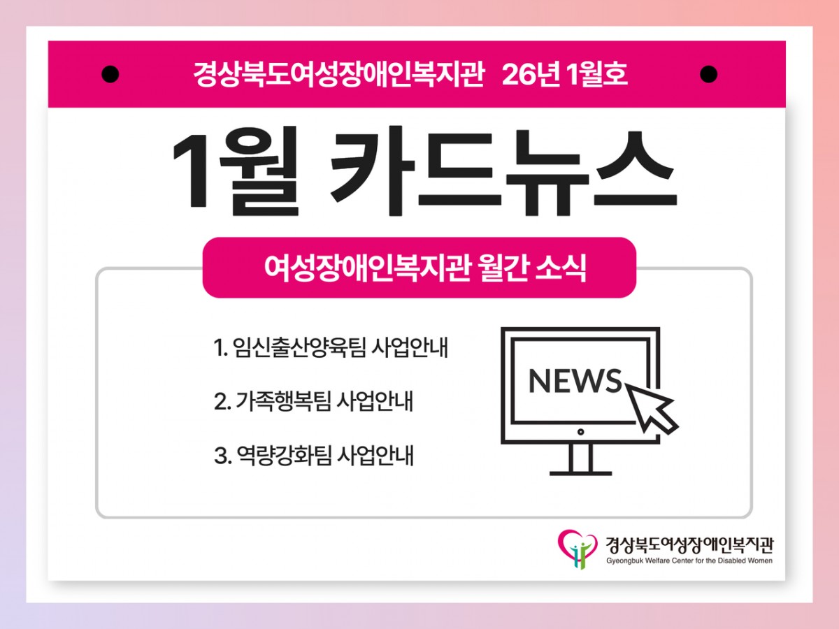 2026년 여성장애인복지관 1월 카드뉴스 전예지 0 36 02.04 13:44 ✨ 25년 12월호 소식 알려드림 ✨안녕하십니까 경상북도여성장애인복지관입니다. 여성장애인과 함께하는 우리 복지관의 특별한 순간들을 모아봤습니다. 작은 변화들이 모여 큰 희망이 되고, 여러분의 관심과 응원이 여성장애인의 삶을 밝히는 힘이 됩니다.