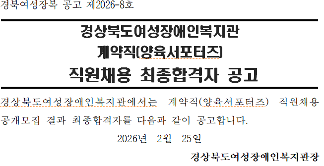 경상북도여성장애인복지관 양육서포터즈 직원채용 최종합격자 공고(제2026-8호) 최고관리자 0 12 02.25 18:50 2026.02.25 18:53 경상북도여성장애인복지관 양육서포터즈 직원채용 최종합격자 공고제2026-8호.hwp (67.0K) + 3