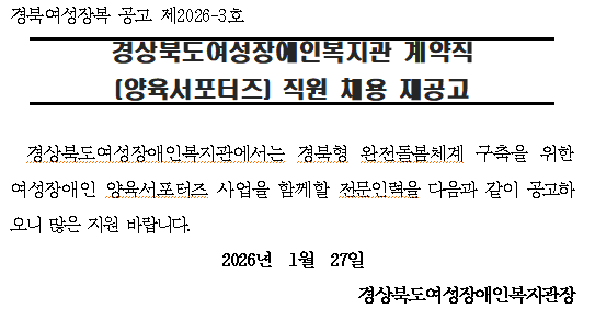 경상북도여성장애인복지관 계약직(양육서포터즈) 채용 공고(제2026-3호) 최고관리자 0 19 01.27 16:21 2026.01.27 16:21 1. 여성장애인 양육서포터즈 응시원서재.hwp (105.0K) + 6