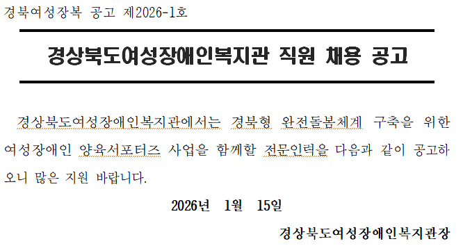경상북도여성장애인복지관 계약직(양육서포터즈) 채용 공고(제2026-1호) 최고관리자 0 87 01.15 19:09 http://gwcdw.or.kr/gwcdw/bbs/board.php?bo_table=bo_04&wr_id=20 + 38