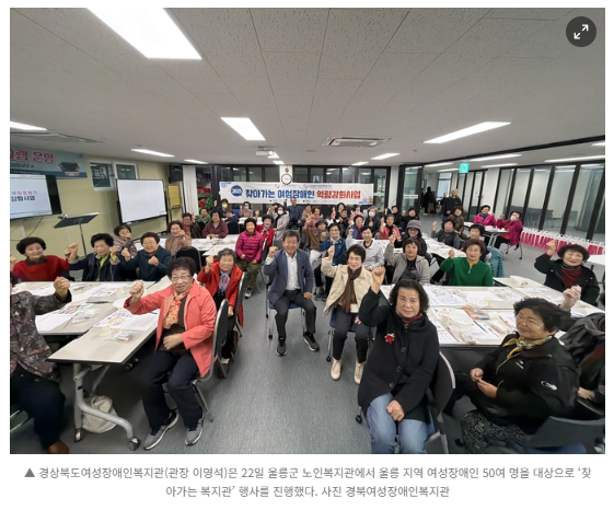 경상북도여성장애인복지관(관장 이영석)은 22일 울릉군 노인복지관에서 울릉 지역 여성장애인 50여 명을 대상으로 ‘찾아가는 복지관’ 행사를 진행했다.