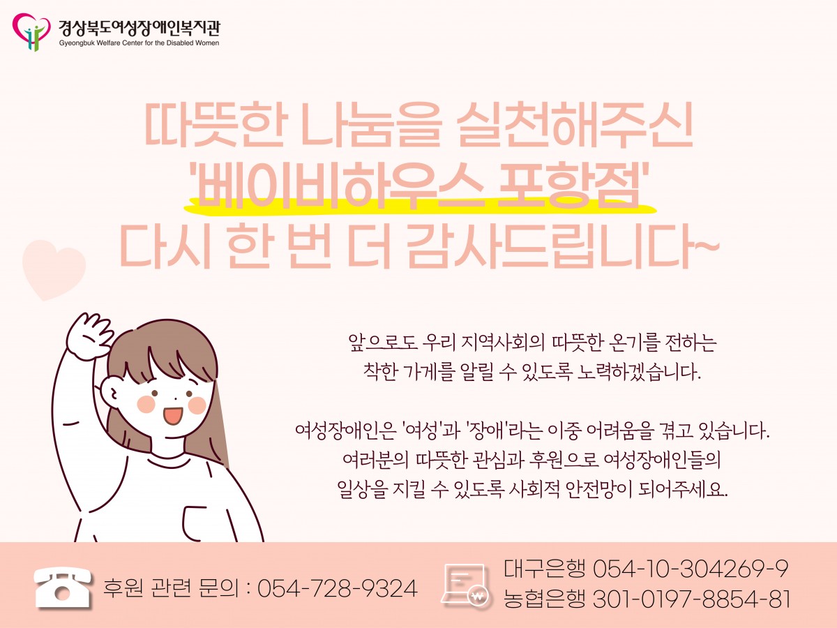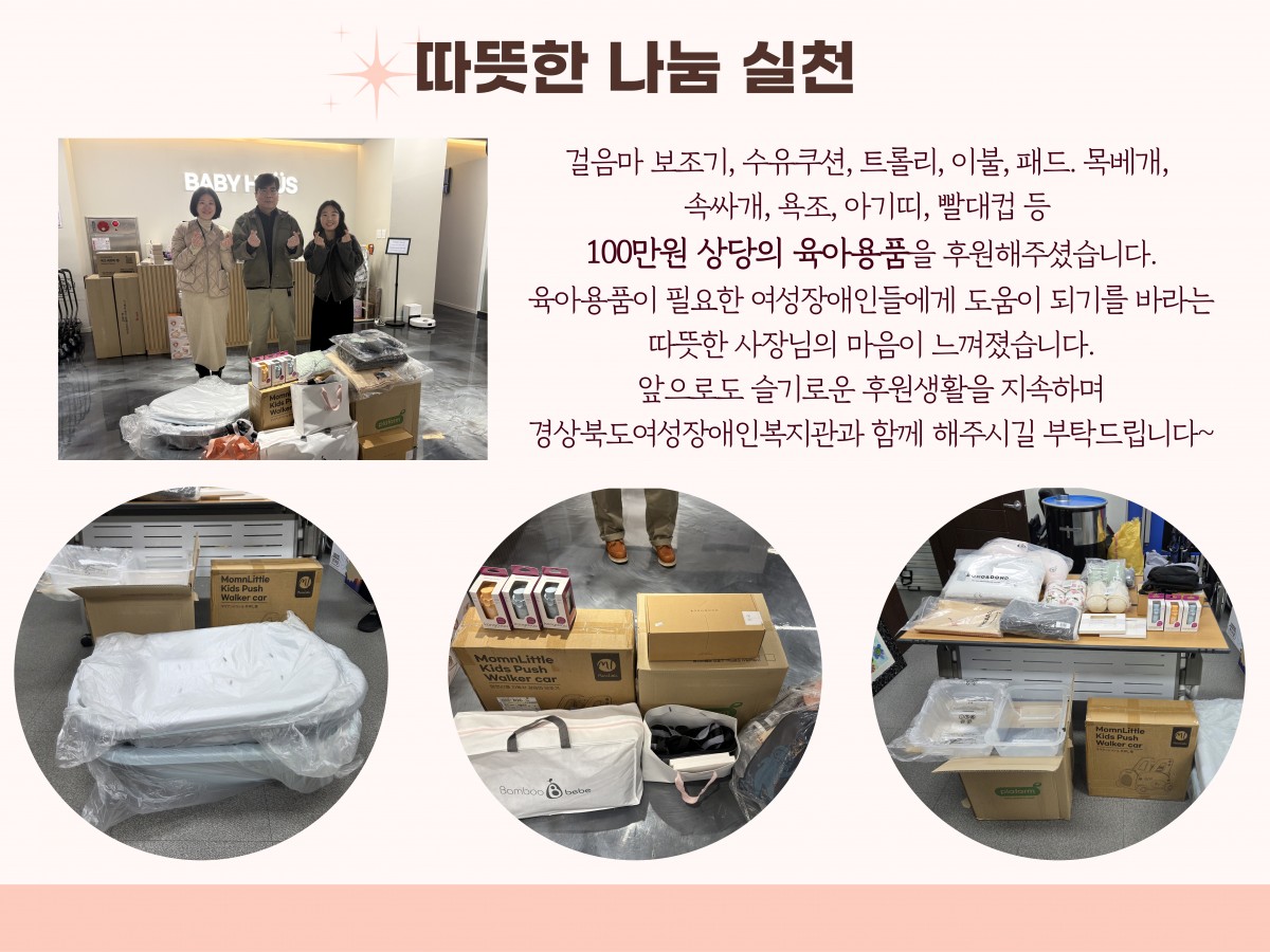 베이비하우스 포항점, 육아용품 전달식 전예지 0 72 01.12 17:01 베이비하우스 포항점에서 여성장애인들을 위한 육아용품을 후원해주셨습니다.여성장애인을 향한 따뜻한 관심과 후원이 여성장애인들에게 하루를 살아가는 용기와 희망이 됩니다.앞으로도 베이비하우스 포항점과 경상북도여성장애인복지관의 나눔 실천이 지속되기를 바랍니다~