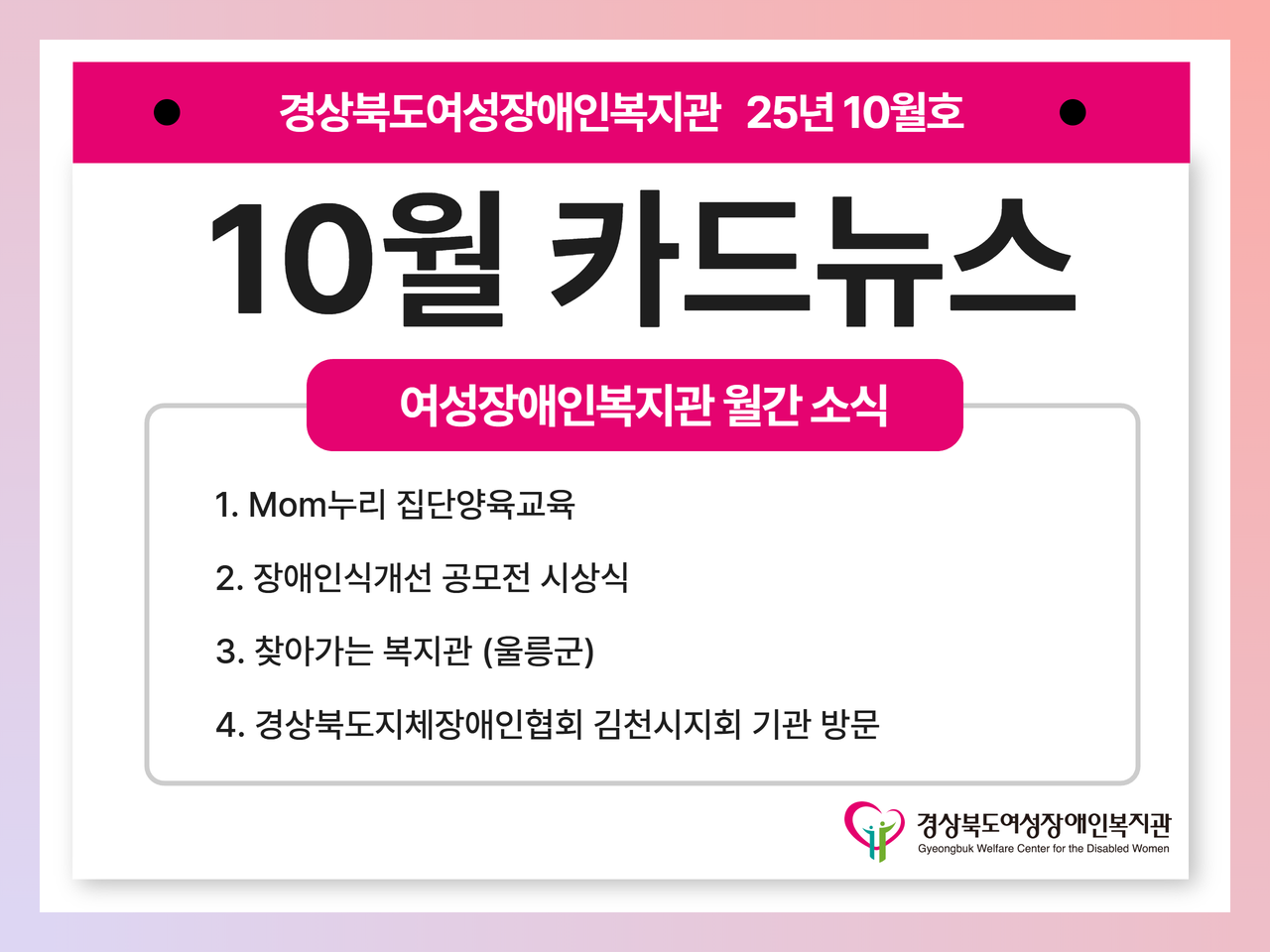 여성장애인복지관 10월 카드뉴스 전예지 0 36 10.31 11:26 https://youtu.be/9dVL_riH1nI?si=xsgw34KjBl9hX-U6 + 2 ✨ 25년 10월호 소식 알려드림 ✨안녕하십니까 경상북도여성장애인복지관입니다. 여성장애인과 함께하는 우리 복지관의 특별한 순간들을 모아봤습니다.작은 변화들이 모여 큰 희망이 되고, 여러분의 관심과 응원이 여성장애인의 삶을 밝히는 힘이 됩니다.
