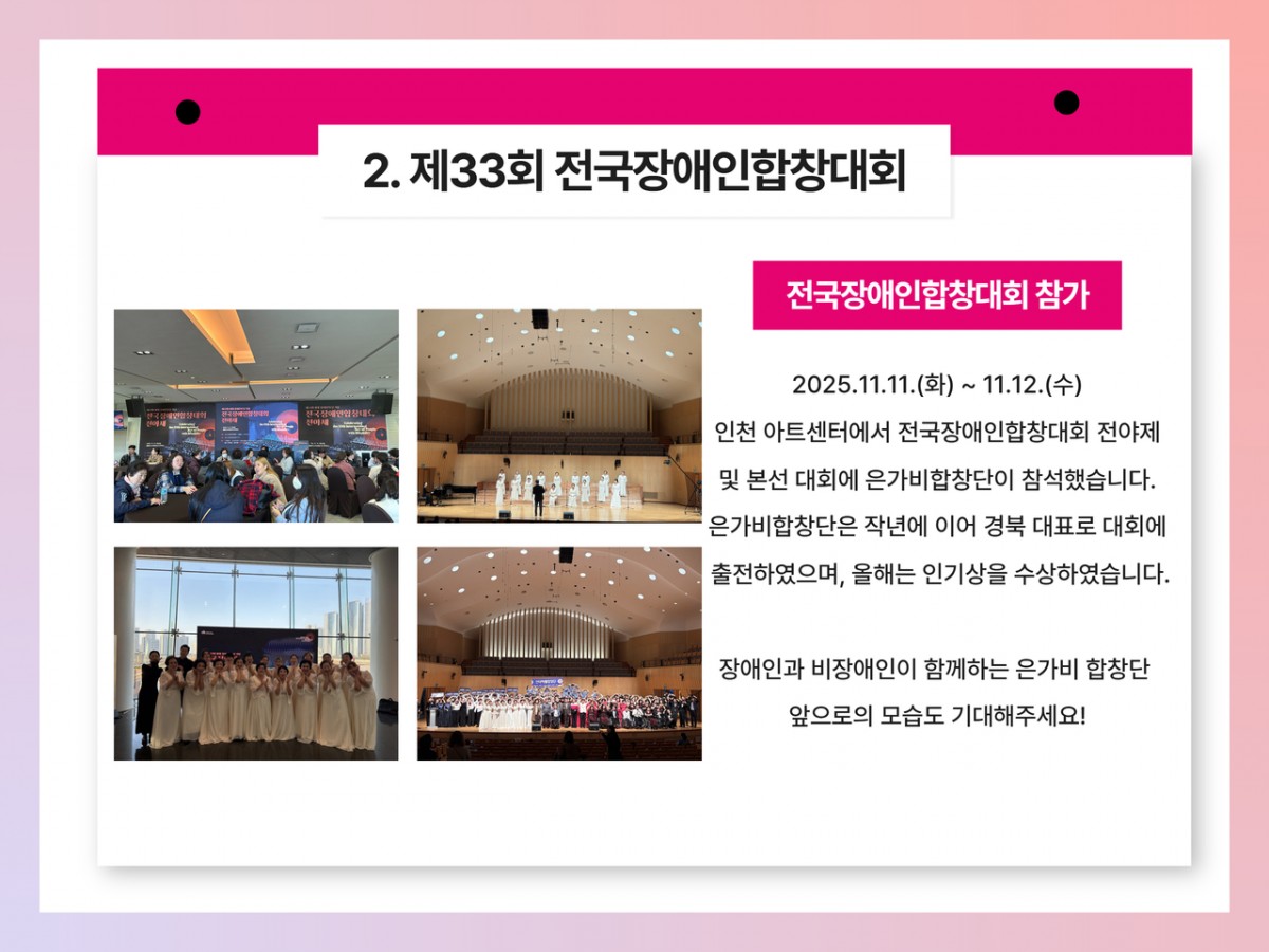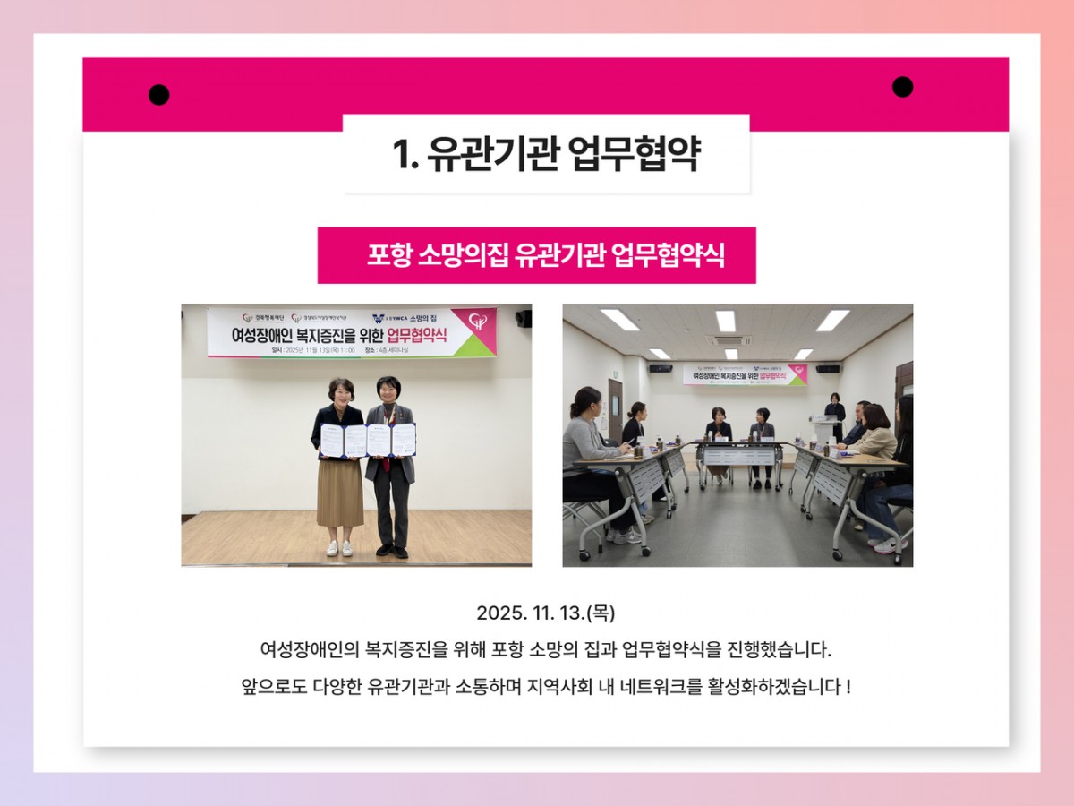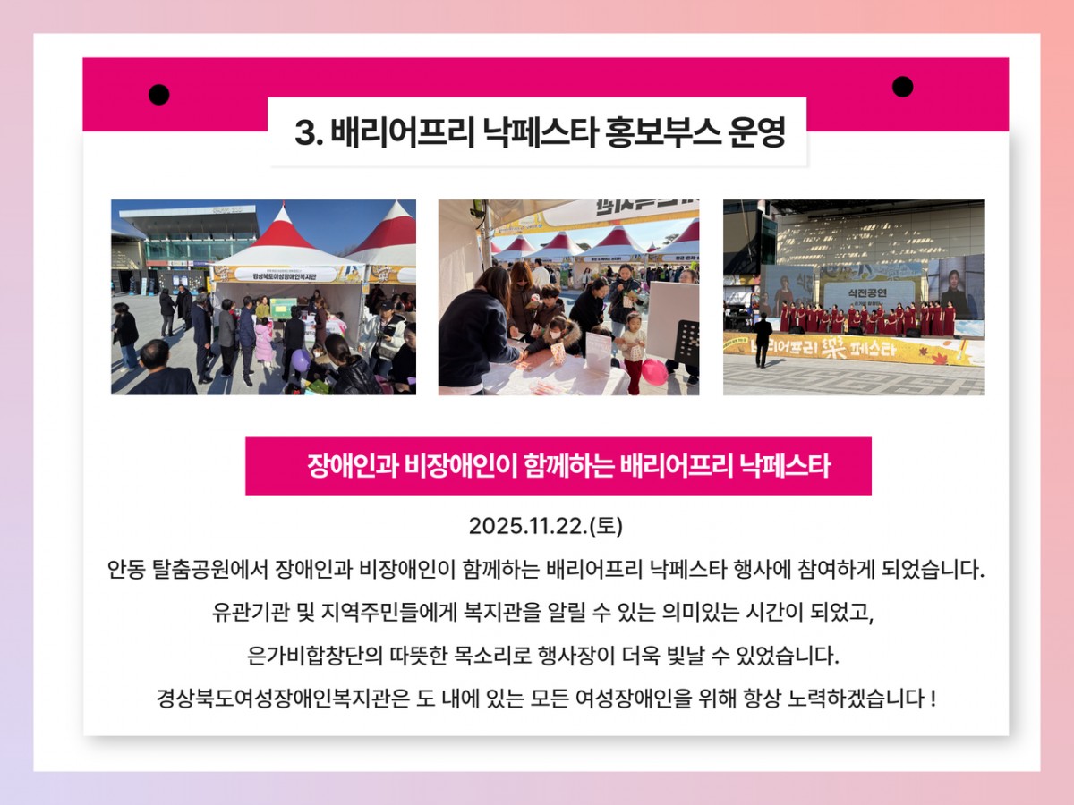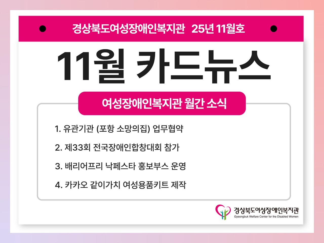 2025년 여성장애인복지관 11월 카드뉴스 전예지 0 3 12.01 11:25 https://www.youtube.com/shorts/g8CfMKfC04s + 0 ✨ 25년 11월호 소식 알려드림 ✨안녕하십니까 경상북도여성장애인복지관입니다. 여성장애인과 함께하는 우리 복지관의 특별한 순간들을 모아봤습니다. 작은 변화들이 모여 큰 희망이 되고, 여러분의 관심과 응원이 여성장애인의 삶을 밝히는 힘이 됩니다.