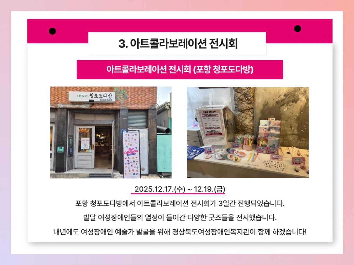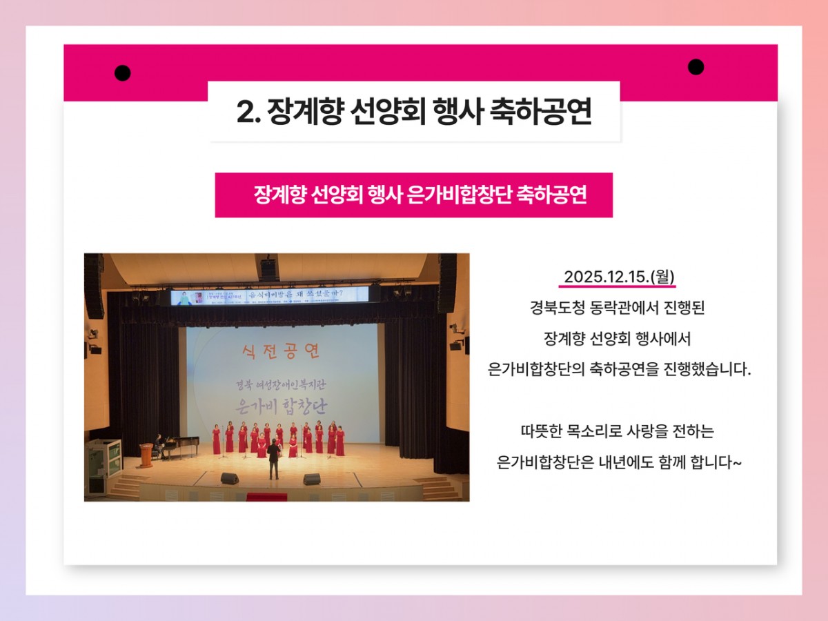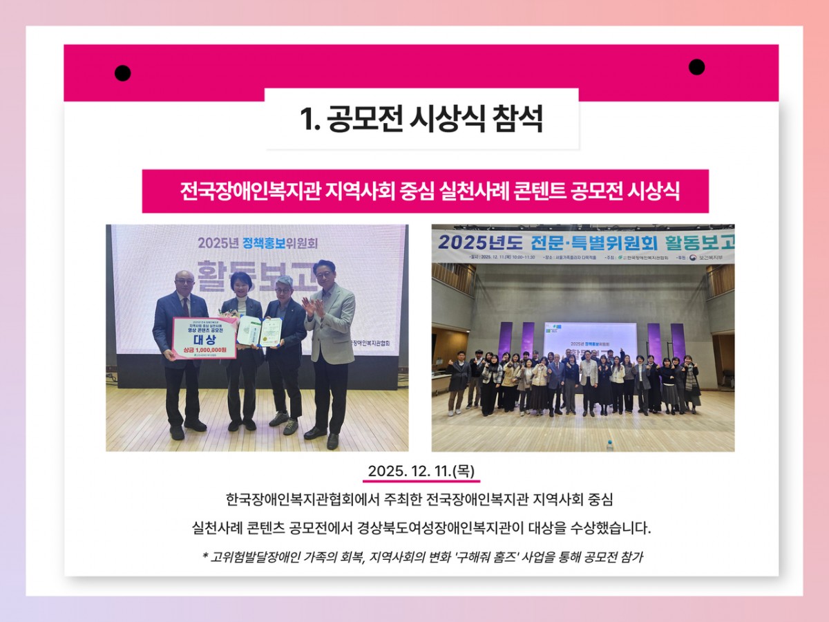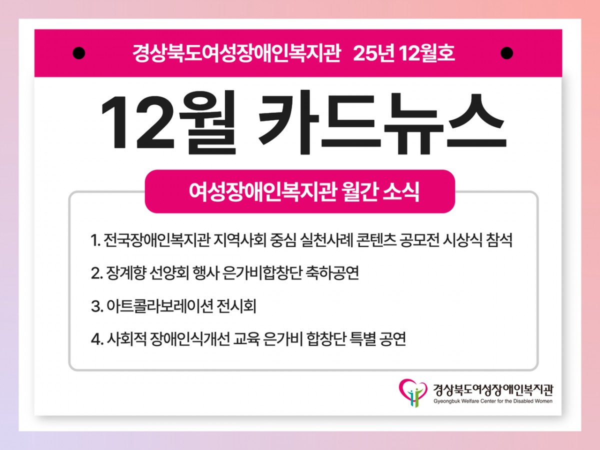 2025년 여성장애인복지관 12월 카드뉴스 전예지 0 88 2025.12.31 09:54 안녕하십니까 경상북도여성장애인복지관 12월 카드뉴스 소식입니다.벌써 2025년의 마지막 날 입니다.내년에도 모두 건강하시고 행복한 일들만 가득하기를 바라며경상북도여성장애인복지관과 변함없이 함께 해주시길 바랍니다.