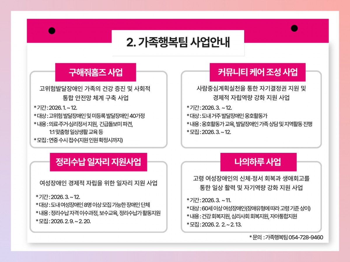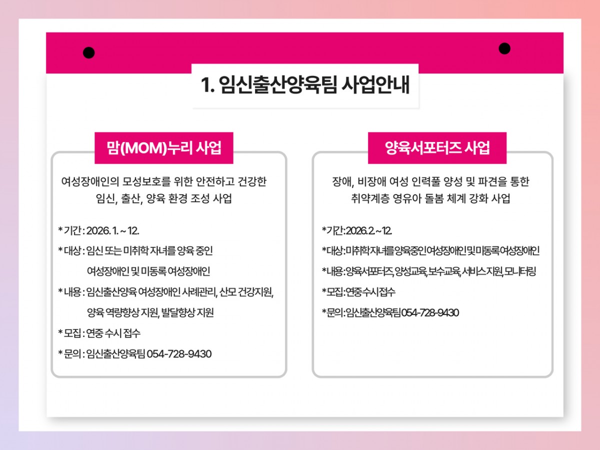 2026년 여성장애인복지관 1월 카드뉴스 전예지 0 14 02.04 13:44 ✨ 25년 12월호 소식 알려드림 ✨안녕하십니까 경상북도여성장애인복지관입니다. 여성장애인과 함께하는 우리 복지관의 특별한 순간들을 모아봤습니다. 작은 변화들이 모여 큰 희망이 되고, 여러분의 관심과 응원이 여성장애인의 삶을 밝히는 힘이 됩니다.